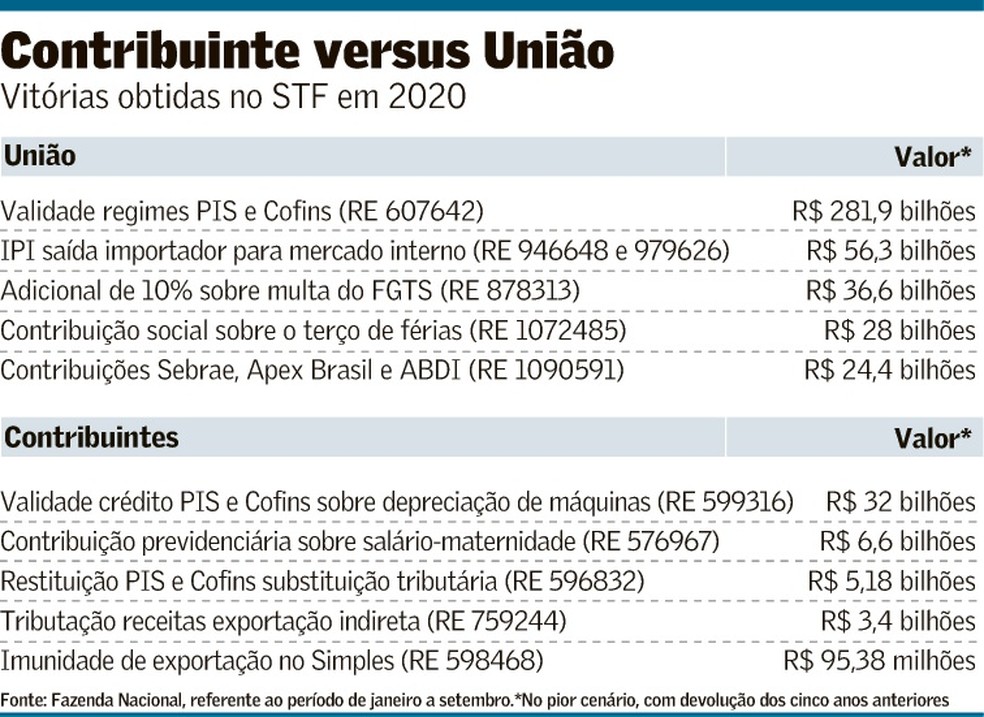 Se contabilizado em reais, o placar, só neste ano de 2020, está em R$ 512,27 bilhões para a União contra R$ 48,13 bilhões para os contribuintes. Os dados constam no relatório de atividades de acompanhamento especial da Procuradoria-Geral da Fazenda Nacional (PGFN) no STF.