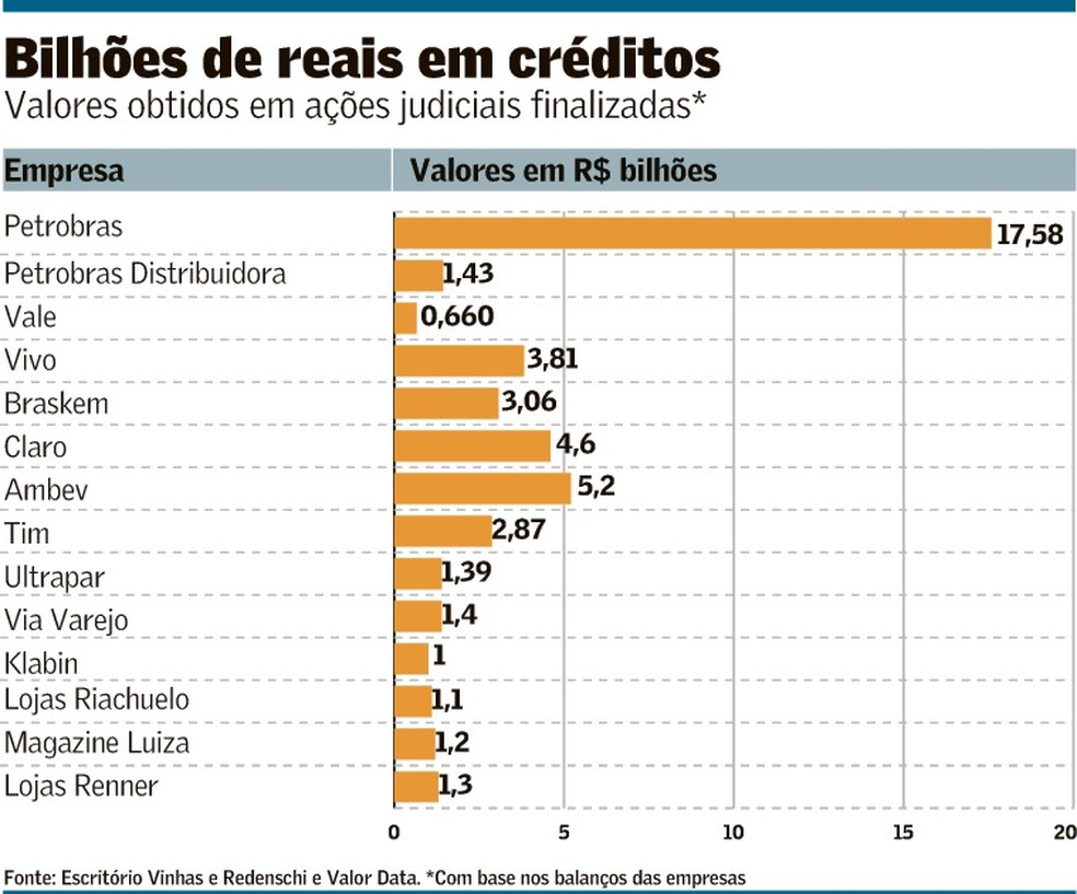 A maioria delas entrou com ação para discutir essa questão antes de março de 2017, data do julgamento de mérito e utilizada para a chamada modulação dos efeitos da decisão. Por esse motivo, o governo será obrigado a aceitar compensações tributárias (uso de crédito para quitar impostos correntes). A Petrobras, por exemplo, ganhou na Justiça o direito a R$ 17,5 bilhões. Claro tem R$ 4,6 bilhões e a Via Varejo, R$ 1,4 bilhão.