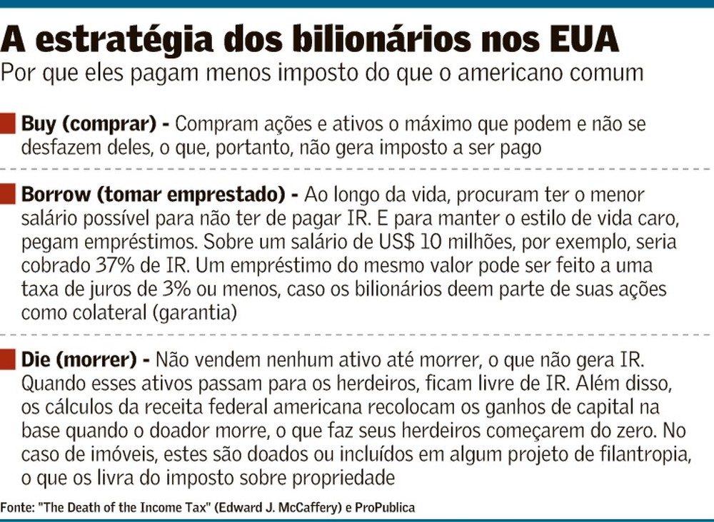 Bilionários nos EUA pagam muito menos impostos do que o trabalhador americano. Para isso não precisam recorrer a estratégias tributárias complexas, instrumentos financeiros complicados ou operações ilícitas. Eles conseguem isso com um esquema simples de três etapas que os livra de pagar imposto de renda, conhecida como buy, borrow, die (comprar, tomar emprestado e morrer).